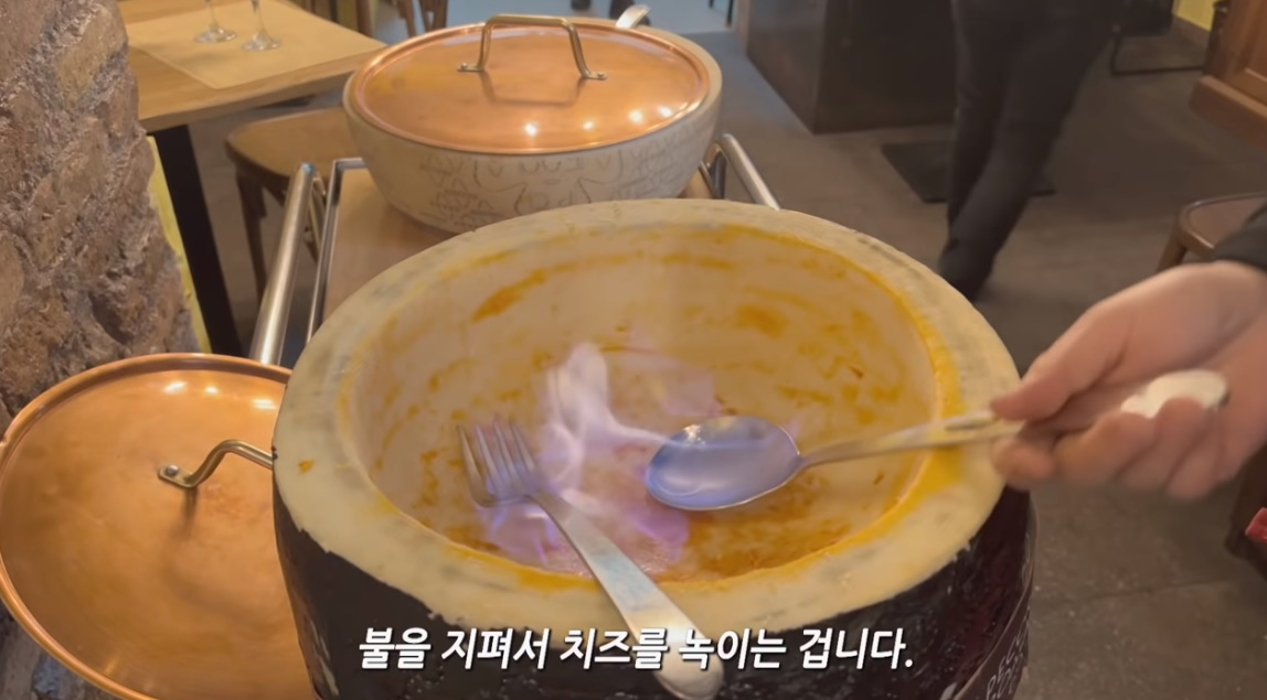 치즈 큰 덩어리에 독한 술을 넣고 불을 질러서